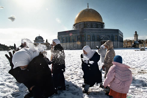 2. Palestinian women play with snow in the grounds of the Dome of the Rock in the old city of Jerusalem (Palestine, 2008) Rula Halawani was born in 1964 in Jerusalem. She studied photography in Saskatchewan, Canada and for her MA at the University of Westminster, London. A freelance photojournalist from 1990-98, her photographs have appeared in publications in Europe, the USA and the Middle East. They have also been shown in many collective and solo exhibitions, including the 2005 Sharjah Biennal. In September 2008, a major retrospective of her work was held in Brussels as part of the Masarat festival of Palestinian art and culture. She teaches in Birzeit University’s Dept. of Photography, which she founded in 2001. Lives and works in Jerusalem. Image1 » Image2 » Image3 » Image4 »